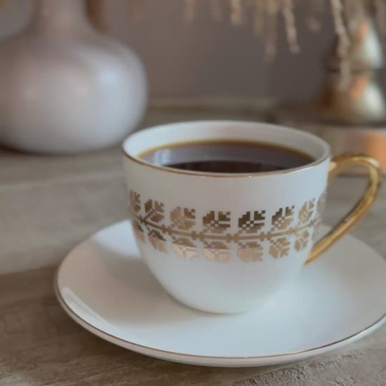 Fine porcelain (fine china) cup and saucer set designed with real gold tatreez (Palestinian embroidery) motifs symbolizing coffee beans.