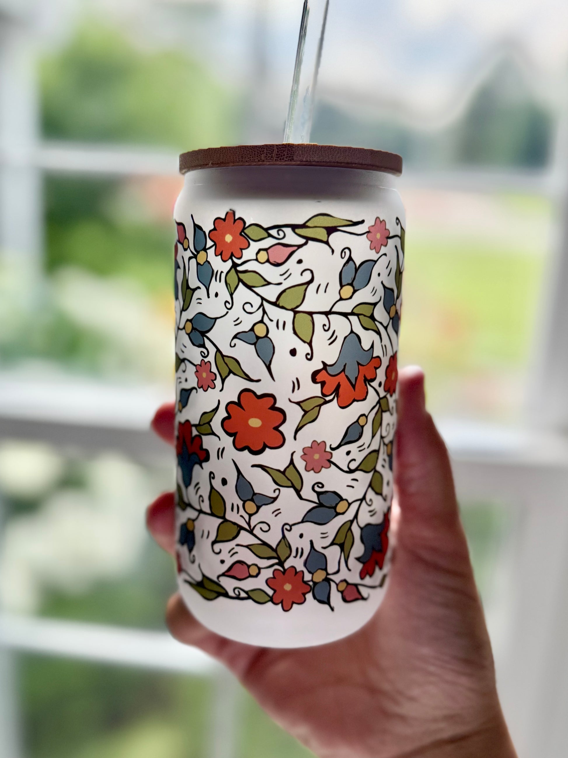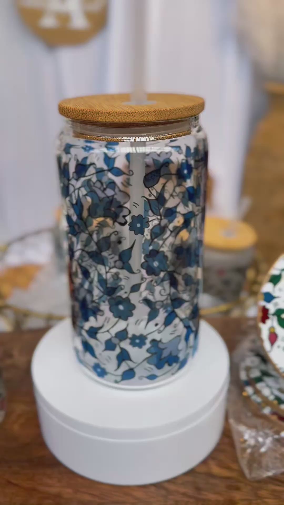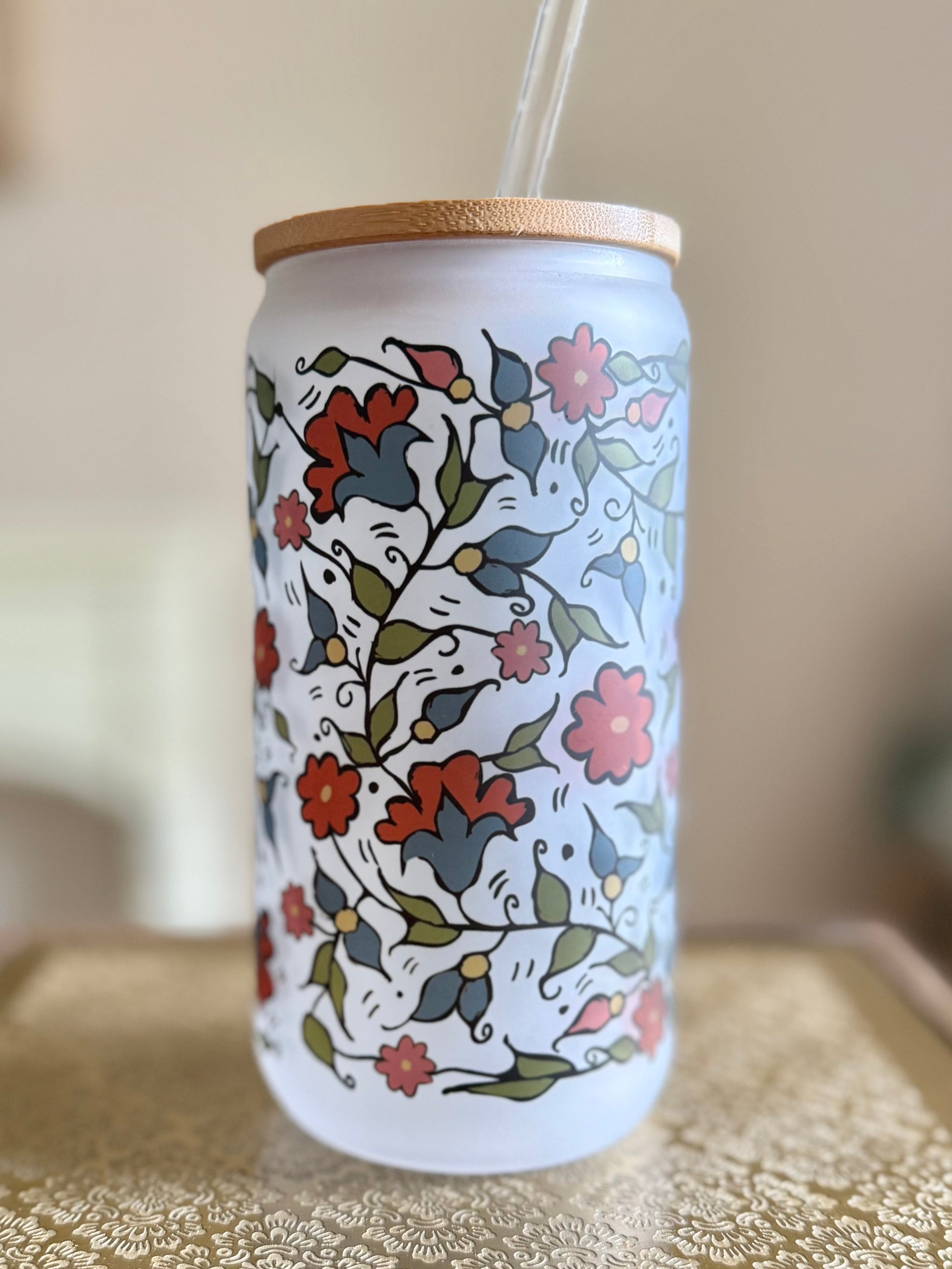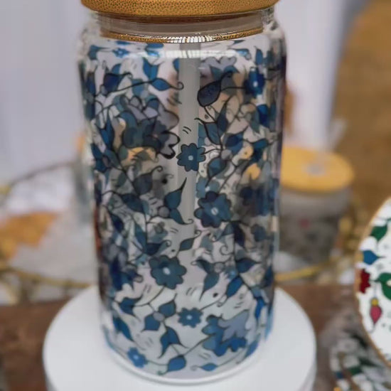 Khalili Hebron Palestinian Glass Mug Cup Tumbler Can Floral Blue Color Design