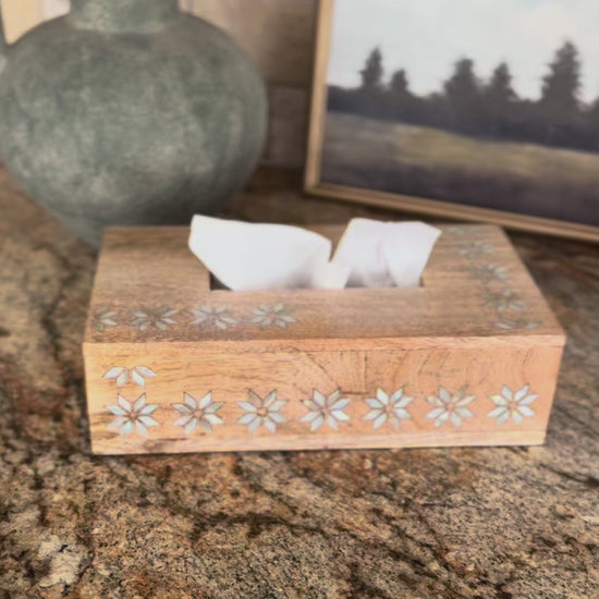 Honoring Palestinian artistry, this limited edition wooden tissue box is inspired by the Moon of Bethlehem tatreez motif, a centuries-old embroidery design passed down through generations. Each piece is crafted from richly grained mango wood and individually hand-inlaid with luminous mother-of-pearl, creating a soft, reflective glow that shifts beautifully with the light.