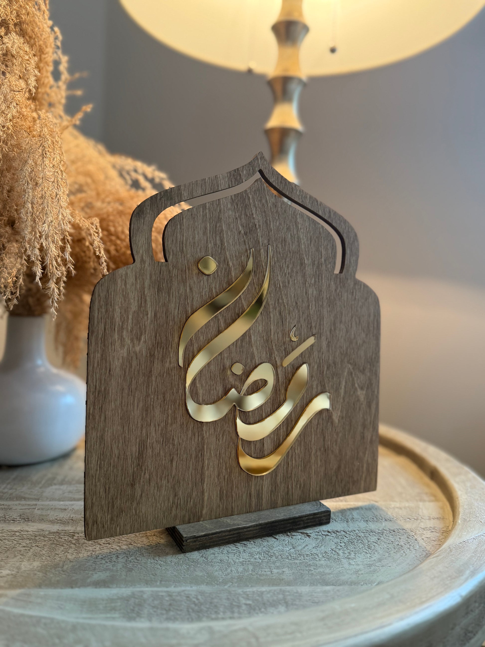 Wooden with layered dimensional writing Ramadan decor sign with stand
